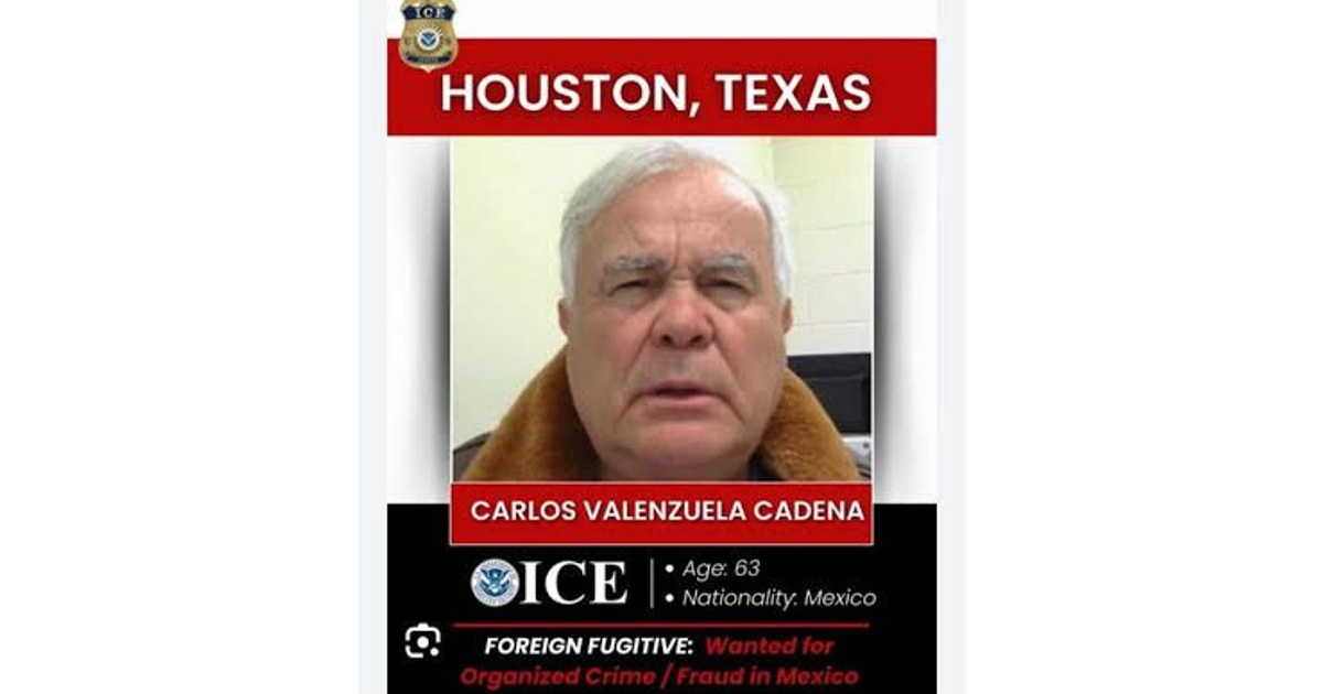 El Servicio de Inmigración y Control de Aduanas de Estados Unidos (ICE) confirmó la detención del empresario mexicano Carlos Federico Valenzuela Cadena en Houston el , y señaló que será entregado a las autoridades mexicanas.