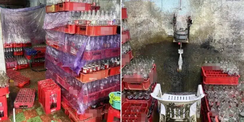 Los agentes de la policía de investigación aseguraron casi 130 cajas de plástico, cada una con seis botellas de tres litros llenas de supuesto refresco de cola, y aproximadamente 797 cajas adicionales, cada una con 24 envases de 600 mililitros, listos para ser rellenados, así como cuatro paquetes de refresco, cada uno con 12 envases de vidrio.
